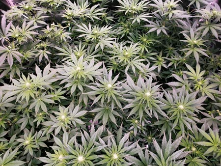 This is what plants look like under the pinkish-white light of quality modern LEDs. The best cannabis LEDs for flowering have a custom “wideband” spectrum designed to grow cannabis plants.