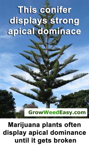 Apical dominance means it tends to grow with one straight “trunk” with many branches in a triangle shape, much like the conifer tree pictured to the right.