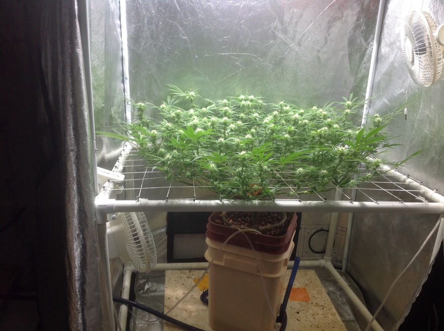 This is our first grow. First pic is two days after transplant from coco coir into hydroton and DWC. Next pic is two weeks after transplanting clones and just before LST and Scrog. Even though it's our first grow we thought we would be brave. Last pic is current. We are holding off on flipping them until we get a tiny spider mite problem under control. We are confident we will have that managed in a couple days as we caught them early from the research we've done.