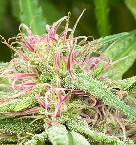 Example of a cannabis plant with pink pistils growing in on the buds