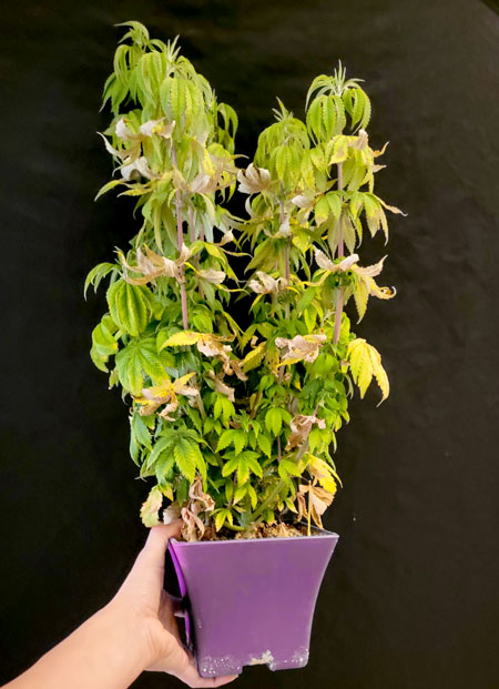 This marijuana plant isn’t showing symptoms yet, but it’s too big for its pot and should be transplanted before initiating the flowering stage (the sensitive time of life when cannabis plants grow buds).
