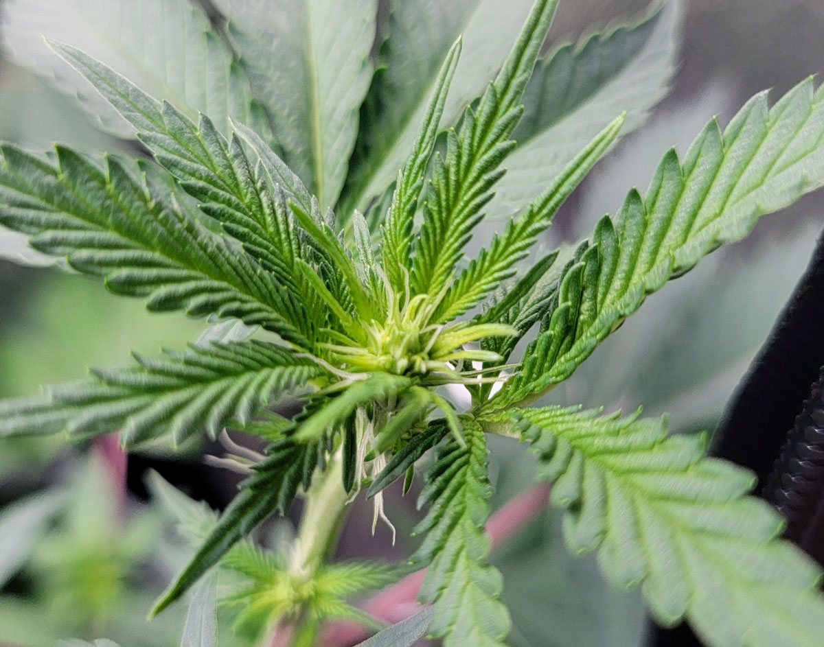 Just 5 days later, I can see the cannabis plant starting to make a few pistils (white hairs), which are the first sign of flowers/buds forming.
