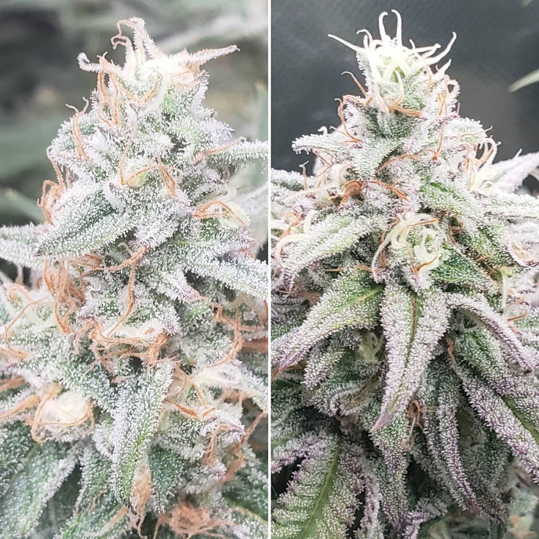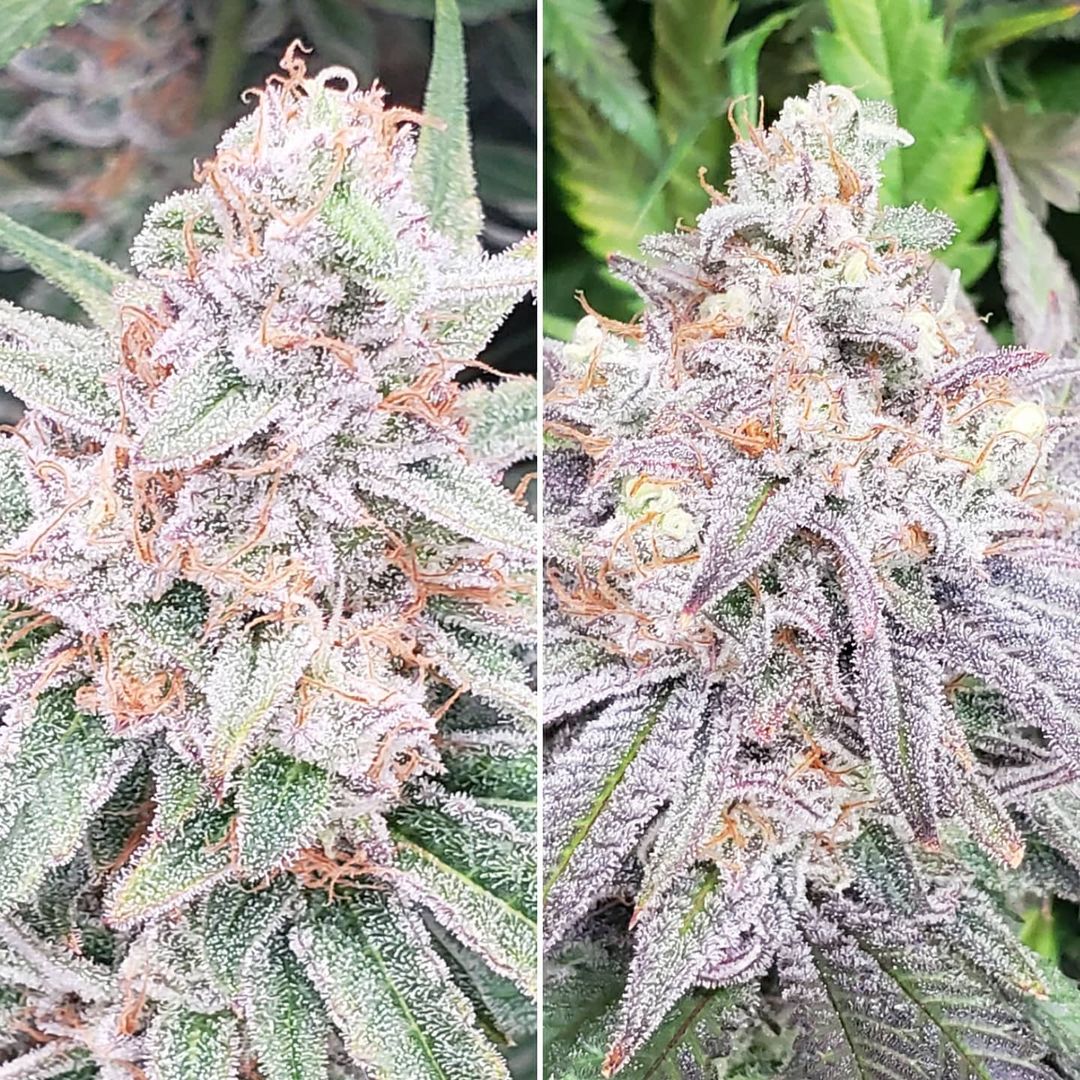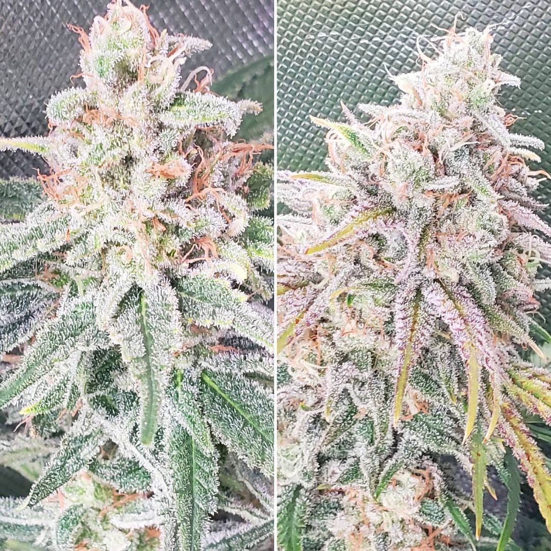 Purple Critical Kush. The buds from these clones look almost exactly the same. (left side is coco, right side is soil)