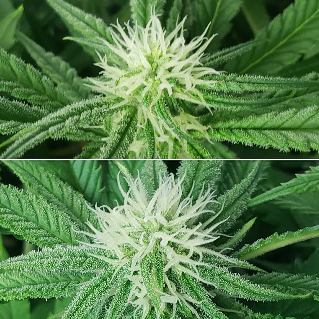 Peyote Critical. These buds look somewhat different. The sugar leaves next to the coco buds are still totally green while the sugar leaves on the soil buds are starting to look a little purple at the tips. (left side is coco, right side is soil)