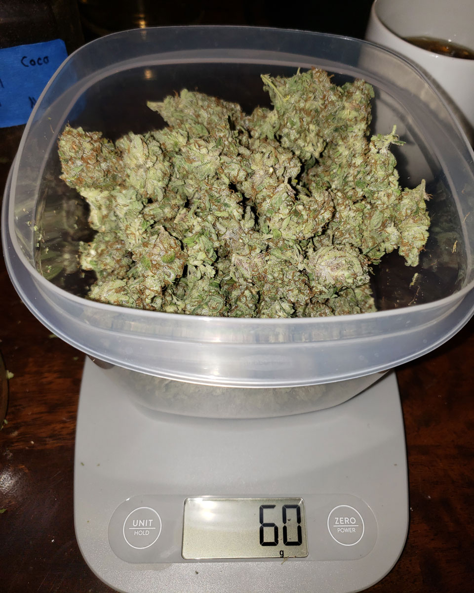 Purple Critical Kush in coco weigh-in (I couldn’t fit it all in one bowl so you’ll see it’s 60 g + 59 g for a total of 119 g)