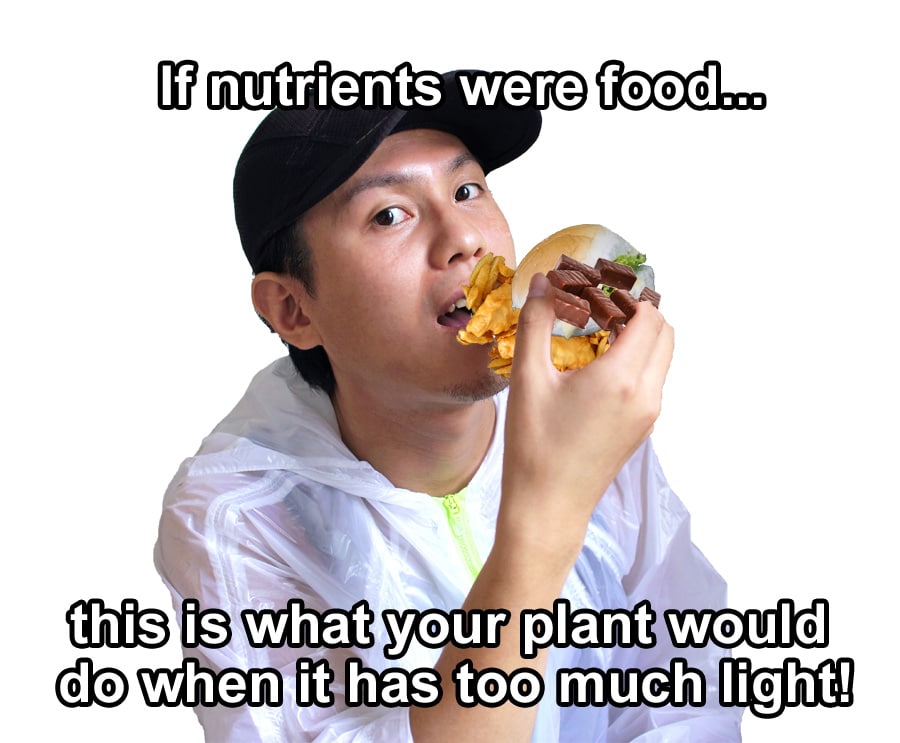 If a plant gets too much nutrients at once, it “doesn’t know what to do with it all” and this causes problems in the plant. Generally the most common symptom is nutrient burn where the tips and edges of leaves get a brown, burnt appearance.