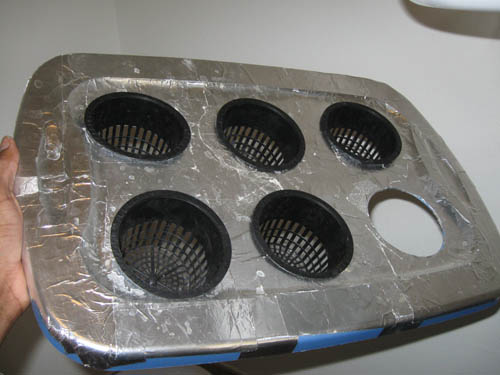 - Place 5 of the 6 net pots in the lid, and put the lid on the container. You will use the empty slot to pour your pH’d water into the container later.