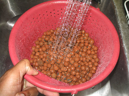 - Now, without dislodging the tubes, pour 1 inch of thoroughly rinsed hydroton rocks into the net pots.