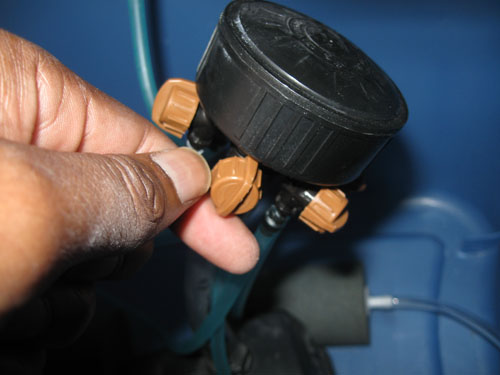 - Twist the little orange-ish valve on the hub for each tube that will be going to an occupied net pot. Make the line on the valve parallel to the blue tube to open it.
