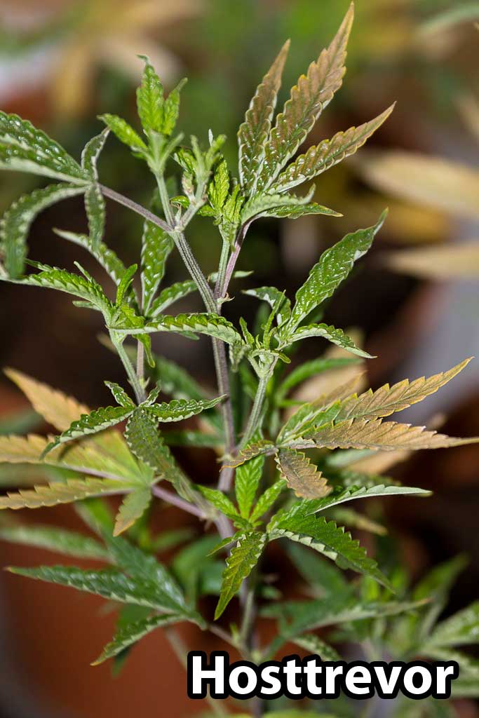 Here’s an example of a cannabis plant that has brown splotches on upper leaves due to low pH. The leaves first turn yellow then brown. As they die, the leaves start curling up.