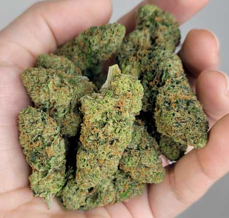 Buds: Dense indica buds that are covered in trichomes, causing a heavy, almost sedating effect (“couchlock”). Our buds smelled earthy, with some fruity, almost minty tones underneath.