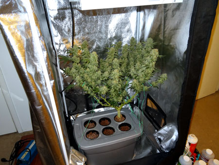 I personally use a 2’x4’x6′ grow tent (0.6m x 1.2 m x 1.8m) when I grow. It can accommodate up to a 400W grow light and can fit in the corner of the room. It also looks a bit like a portable clothes wardrobe, adding a bit of stealth. I like that with this size, you can easily reach all the plants, yet still produce 16 oz (1 pound) or more in the right conditions, like this harvest under a 315 LEC grow light. Learn how to copy this setup.