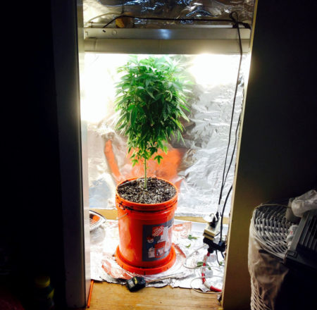 Stephen has his plants in a 3-gallon container in a 2’x5’ tent under a 100W incandescent bulb.